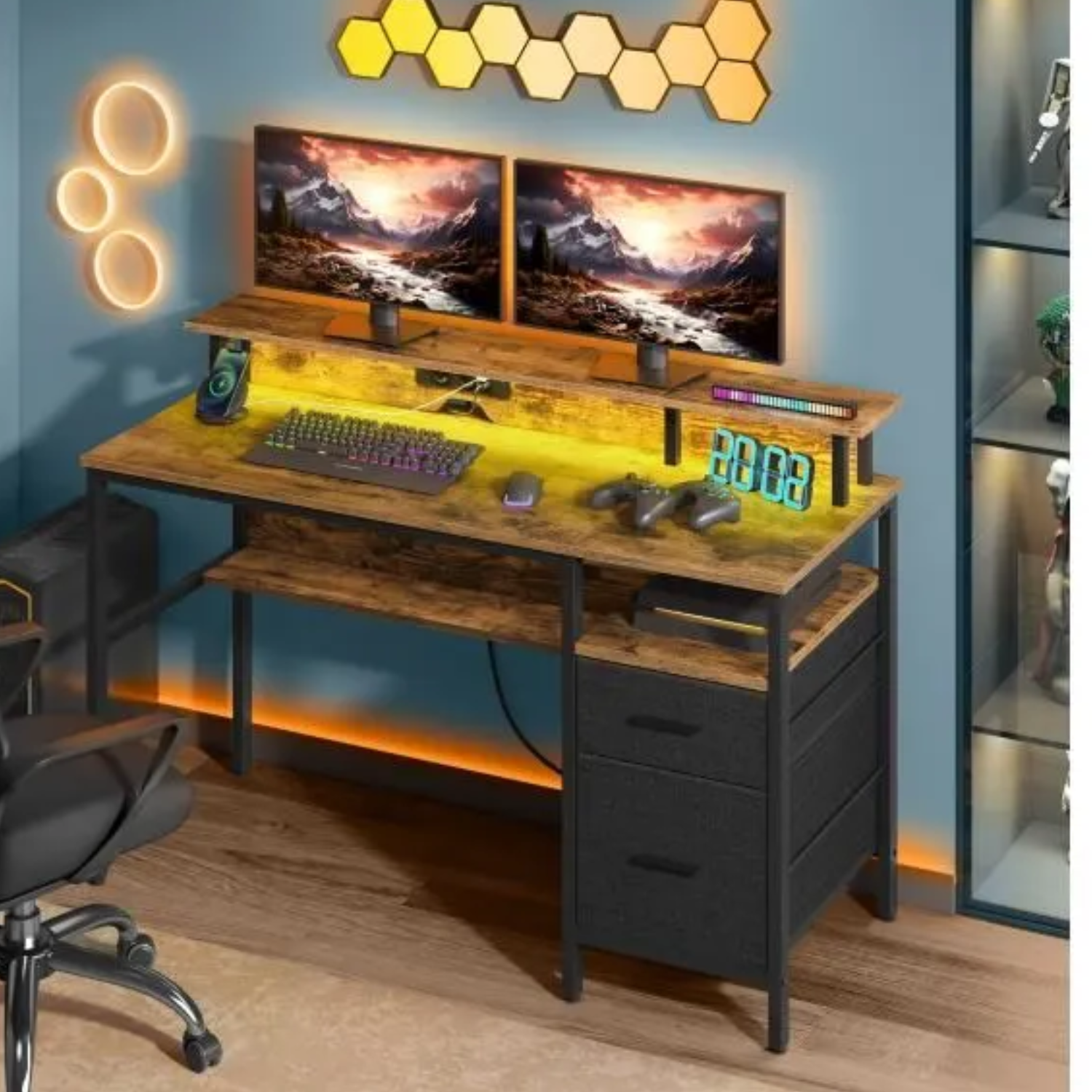 【AMBIANCE PERSONNALISÉE】Ce bureau gaming est doté d’un éclairage LED intégré, vous offrant un choix de 20 couleurs, 6 modes de clignotement, 5 niveaux de luminosité et 5 vitesses de clignotement. Personnalisez l’ambiance de votre pièce