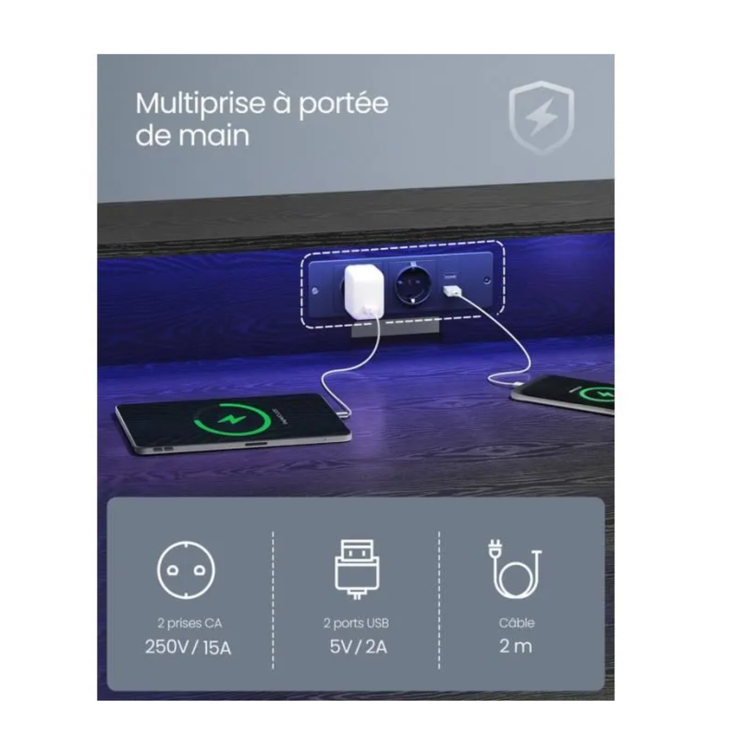 [Multiprise intégrée pratique] Équipée de 2 prises et de 2 ports USB, la multiprise permet de brancher plusieurs appareils en même temps. Immergez-vous pleinement dans votre univers de jeu, sans aucune interruption ni souci de chargement